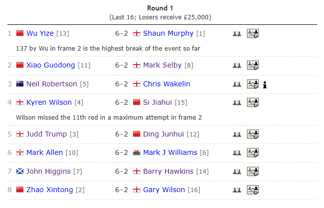 大师赛15日比赛交手记录:赵心童4-7希金斯 特鲁姆普vs艾伦15胜1平19负
