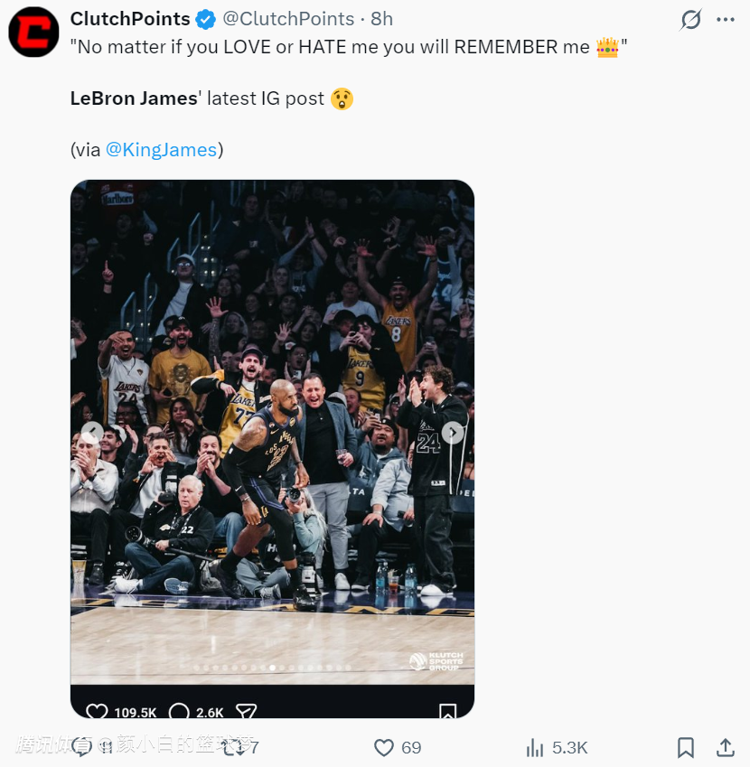 几小时前勒布朗在个人IG更新了一句话:不管你是爱我还是恨我,但你一定会记住我。(他发布的是对阵老鹰比赛的图)老头也知道很多人还在骂他,但他根本无所谓。