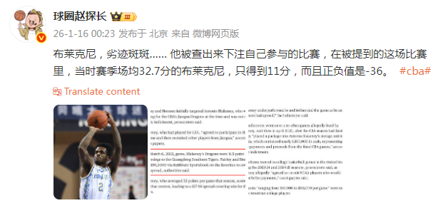 2026-01-16 01:00媒体人赵探长晒出美国媒体的报道截图,称前CBA外援布莱克尼被查出打假球的新证据。布莱克尼不仅下注自己参与的比赛,而且故意在比赛里发挥失常。