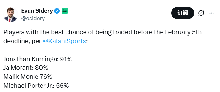根据Kalshi Sports的数据,库明加的最新交易概率达到91%,高居榜首。他在本赛季早些时候几乎完全跌出了勇士的轮换阵容,自12月19日后便再未登场。如果湖人最终将他列为引援目标,他们将寄望于全新的环境和更多的出场时间,能帮助库明加在其NBA生涯第五个赛季的下半程找回状态、迎来反弹。