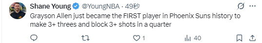 太阳队史首人!阿伦单节3三分+3盖帽 独得13分最后一攻送高难度压哨