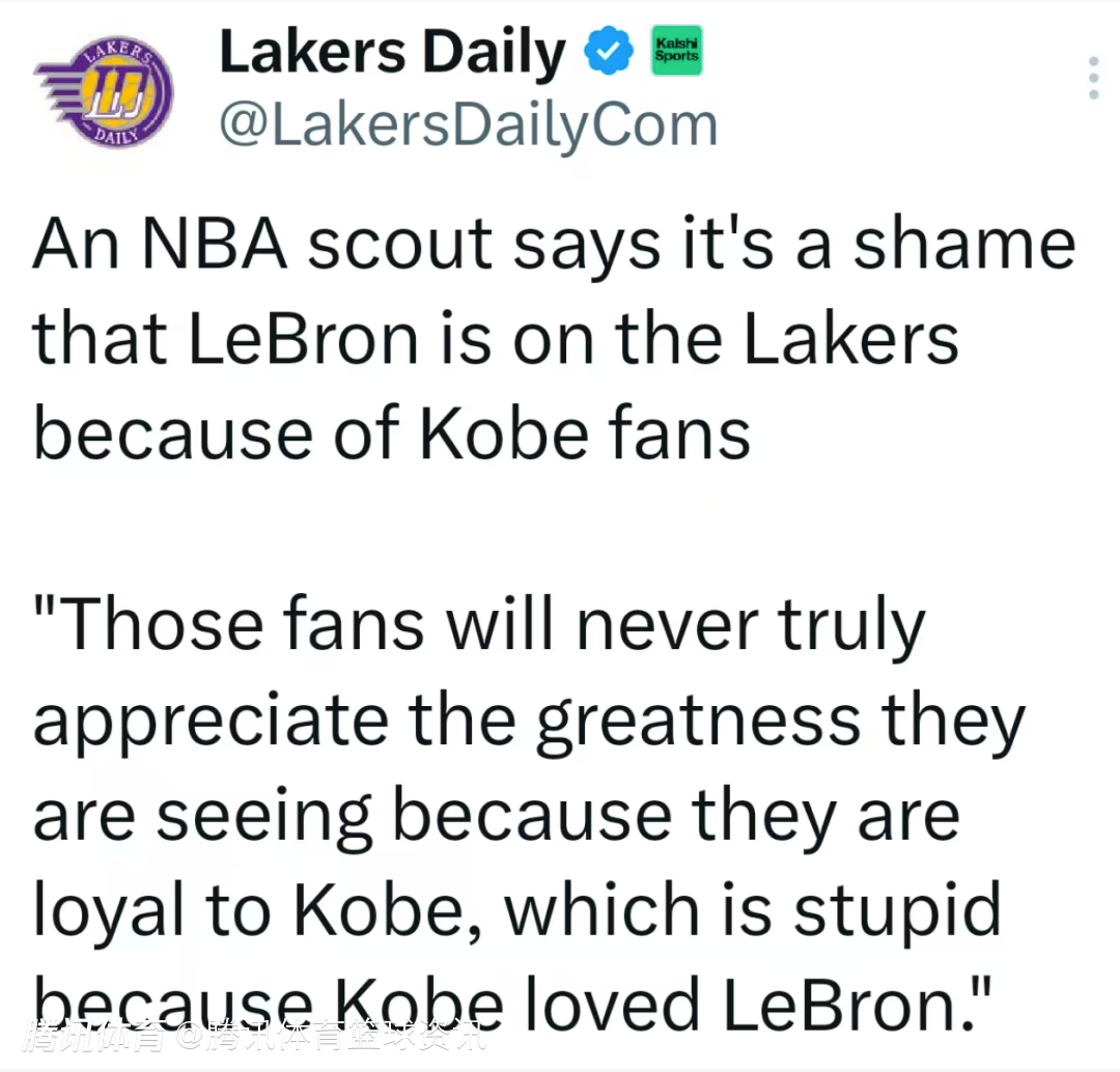 球探为詹皇鸣不平:湖人球迷只忠于科比很可笑 不会欣赏眼前的伟大