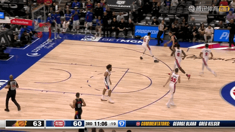 第三节还剩9分24秒至7分04秒,活塞连续五次进攻得分,哈里斯突破抛投、杜伦扣篮与补扣、汤普森补篮以及邓肯-罗宾逊三分轮番命中,将比分从71-64追至74-73。