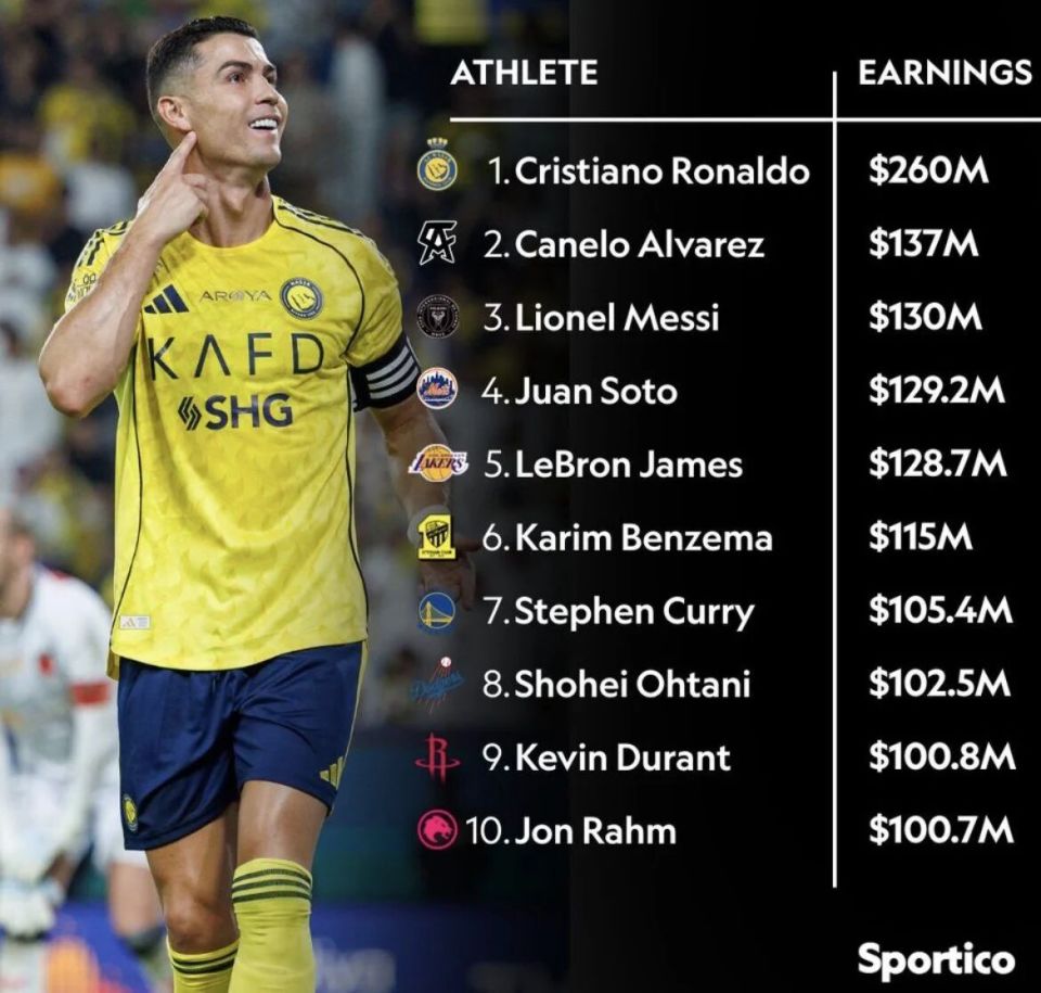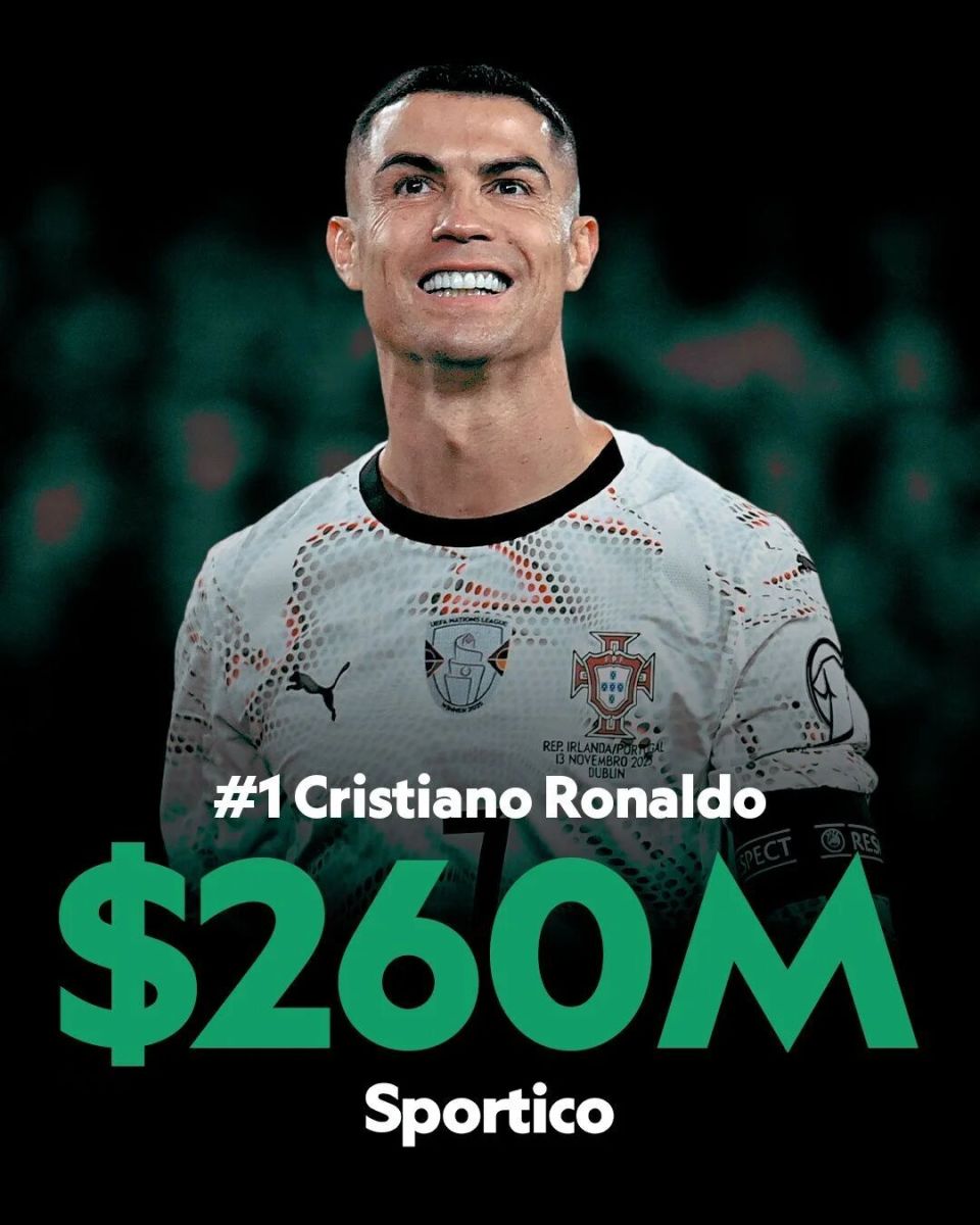 2026-01-16 12:10撰稿/寒冰 美国体育财经在线媒体Sportico近日公布了2025年度收入最高的100名运动员排行榜,在利雅得胜利税后年薪2亿+(美元,下同)的C罗去年总收入达2.6亿,连续3年排名榜首,是名副其实的运动圈“世界首富”。