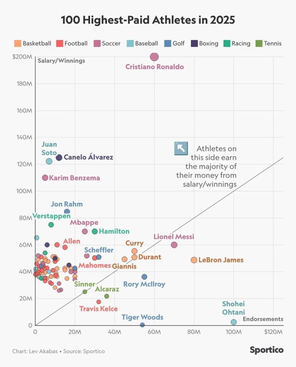 C罗能连续3年霸榜,全靠至少2亿的固定税后年薪。即便不算6000万的商业收入,他也能排名第一。但如果排列运动员的商业收入,C罗(6000万)只能退居第四,梅西(7000万)超过C罗排名第三,勒布朗·詹姆斯(8000万)排名第二,高居榜首的美职棒洛杉矶道奇队的日本巨星大谷翔平(1亿)。某种程度上,巨星们的商业收入相比不同资本背景导致差异巨大的年薪,更能体现他们的商业价值。