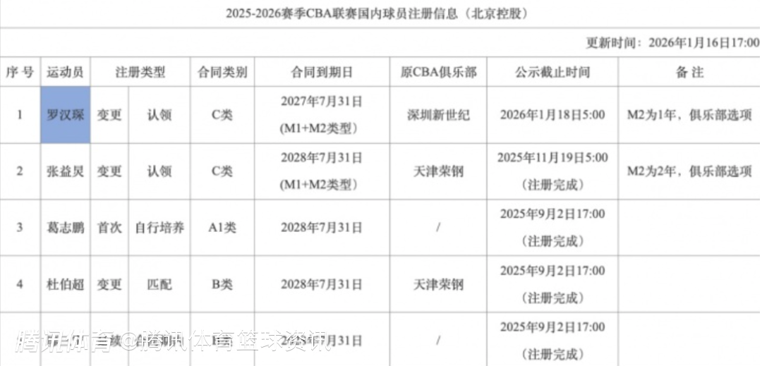 2026-01-16 18:00北京时间1月16日,CBA官网更新了国内球员注册信息,罗汉琛与北控男篮签下2年C类合同,第二年为球队选项。此前就有国内媒体报道称,罗汉琛在和北控男篮深入接触,双方有望签约,随着此番正式签约,这也是罗汉琛职业生涯首次披上北区球队的球衣。