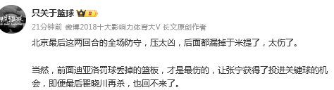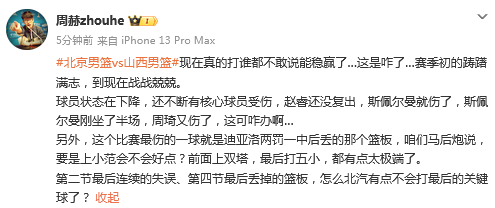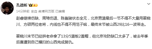 翟晓川末节已经拼老命拿了13分5篮板2盖帽,但北京攻防缺口太多了,被去年季后赛遭到自己横扫的山西完成复仇。