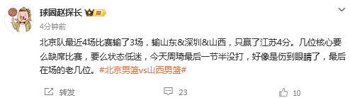 北京队最近4场比赛输了3场,输山东&深圳&山西,只赢了江苏4分。几位核心要么缺席比赛,要么状态低迷,今天周琦最后一节半没打,好像是伤到眼睛了,最后在场的老几位。