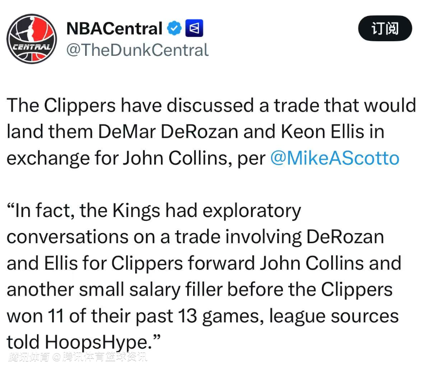 Scotto表示:“联盟消息人士透露,事实上,在快船过去13场赢下11场之前,国王队曾就一笔涉及德罗赞和埃利斯的交易进行过试探性对话,希望用他们换取快船前锋约翰-科林斯以及另一名小额薪资(球员)的添头。”
