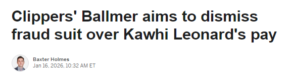 2026-01-17 07:00北京时间1月17日,ESPN发文报道,据法庭文件披露,快船老板鲍尔默的代理律师正寻求驳回一项针对他的欺诈诉讼。该诉讼指控鲍尔默通过一家现已倒闭的绿色金融公司暗中向球星莱昂纳德输送资金,律师团队斥这些指控耸人听闻且纯属捏造。