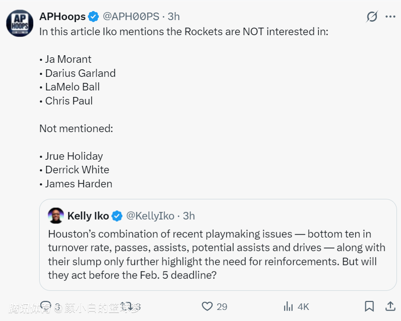 北京时间1月17日,凯利-伊科的推文披露了火箭队在交易截止日可能的动向,他表示火箭队已经收到关于伊森、卡佩拉、芬尼-史密斯等多人的询价,火箭队不会为了补强一号位而仓促的做决定,但火箭队对莫兰特、加兰、拉梅洛、保罗这些控卫不感兴趣,但文中没有说对