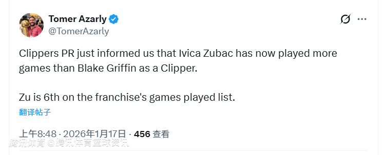 里程碑!祖巴茨为快船出场数达到505场 超越格里芬独占队史第6