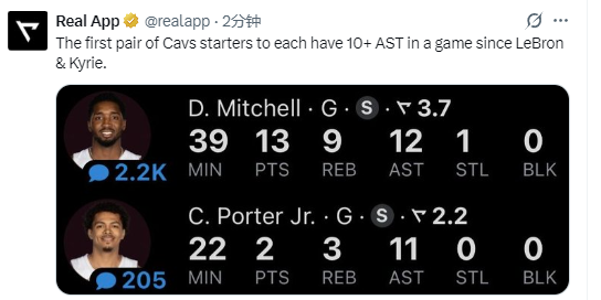 本场比赛,克雷格-波特得到2分11助攻,他和米切尔同场比赛均助攻上双,上一对能做到这点的骑士组合,还是勒布朗-詹姆斯与凯里-欧文。