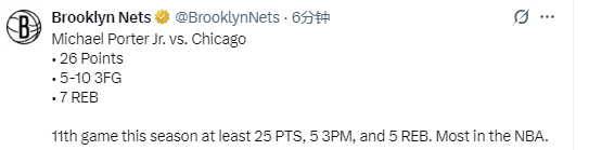 2026-01-17 11:30北京时间1月17日,NBA常规赛继续进行,篮网队112-109险胜公牛队。小迈克尔-波特此役17投9中(三分球10投5中)得到26分7篮板1助攻1抢断,在比赛最后时刻,小波特命中反超比分的上篮。