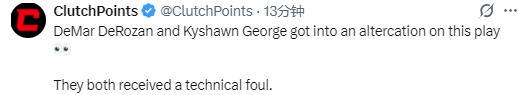 2026-01-17 13:00北京时间1月17日,NBA常规赛继续进行,国王队对阵奇才队。本场比赛进行到第三节,德罗赞和凯肖恩-乔治发生冲突,双双吃到技术犯规。