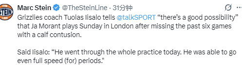 2026-01-17 23:10北京时间1月17日,灰熊队主教练伊萨洛接受媒体采访,透露莫兰特大概率将从小腿伤势中康复,出战在伦敦对阵奥兰多魔术的比赛。