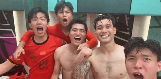 回到更衣室之后,王钰栋与拜合拉木、鲍盛鑫、蒯纪闻、王博豪等队友脱掉球衣疯狂庆祝。面对镜头,U23国足球员兴奋欢呼,而脱掉球衣庆祝也让他们展示了自己的肌肉。