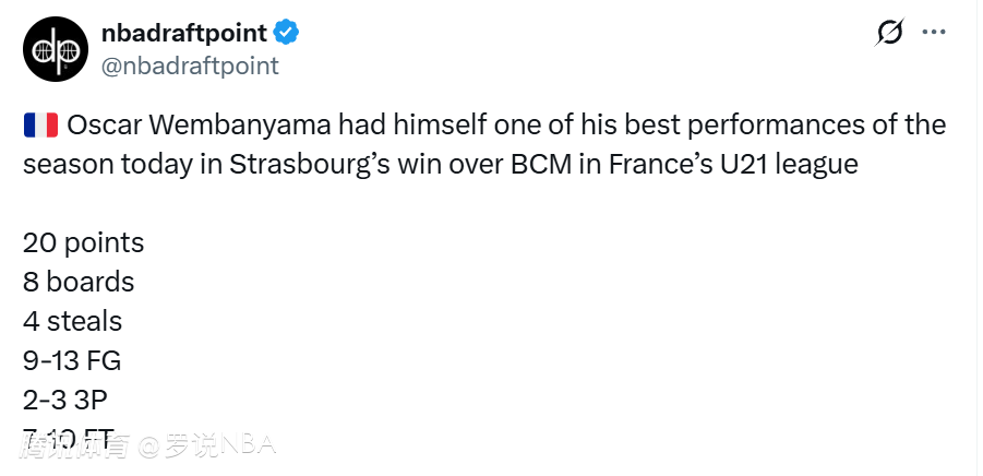 在今日法国U21联赛斯特拉斯堡队战胜BCM的比赛中,文班亚马的弟弟奥斯卡-文班亚马表现出色,全场得到20分8篮板4抢断,投篮13中9,三分3中2,罚球10中7。奥斯卡现年18岁,目前身高已经达到2米03,他将有资格在今年参加NBA选秀。他是一名全能型的前锋。