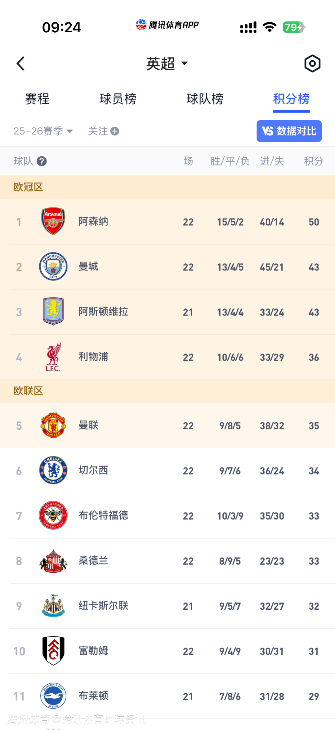 英超第22轮积分榜变动:枪手稳坐榜首 曼市德比改写争四格局