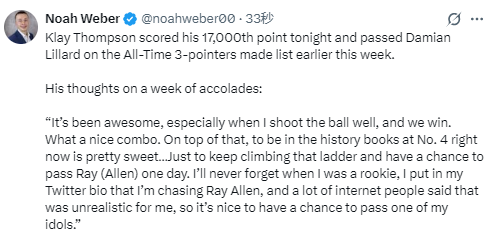 克莱今晚生涯总得分突破17000分大关,且在本周早些时候,他的生涯三分命中总数超越利拉德,升至历史榜单第4。谈及本周收获的两项里程碑荣誉,克莱表示:“这感觉太棒了,尤其是在我投篮手感火热、球队还能赢球的时候,这种双重喜悦简直完美。更重要的是,现在能以历史第四的身份载入史册,真的很振奋,我会继续向着更高的排名攀登,希望有朝一日能超越雷-阿伦。”