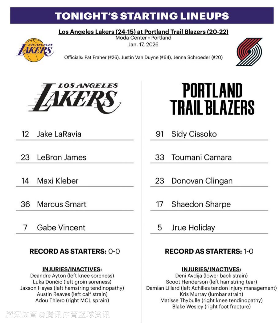 2026-01-18 10:50北京时间1月18日,今天上午11点,湖人将客场对阵开拓者,赛前双方的首发名单出炉。