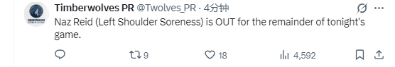 2026-01-18 10:50北京时间1月18日,NBA常规赛继续进行,马刺队对阵森林狼队。本场比赛进行到第三节时,森林狼队官方宣布,里德因为左肩酸痛将缺席今晚剩余的比赛。