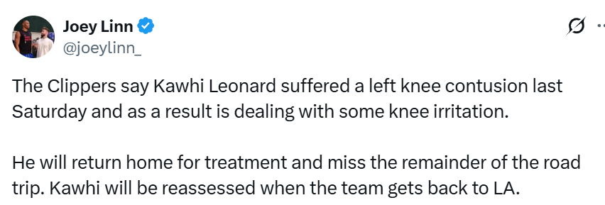 2026-01-19 05:20北京时间1月19日,快船官方表示,科怀-莱昂纳德于当地时间上周六遭遇左膝挫伤,进而引发了膝盖的炎症反应。他将返回洛杉矶接受治疗,并缺席球队客场之旅的剩余赛程。待球队回到洛杉矶后,莱昂纳德的伤情将重新接受评估。