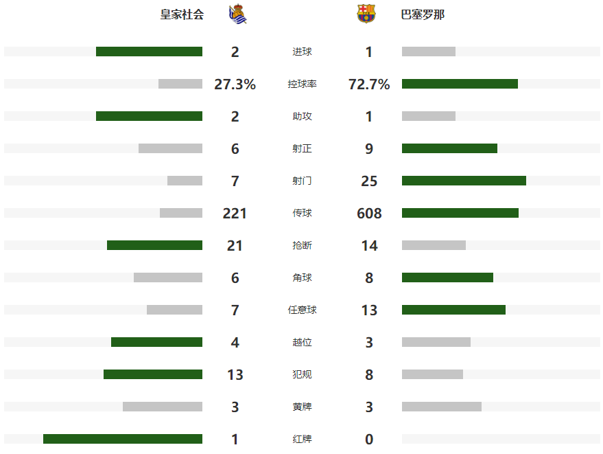 2026-01-19 06:20北京时间1月19日凌晨,西甲第20轮中,巴萨客场2-1不敌皇家社会,联赛9连胜告终,仍领先皇马1分领跑。奥亚萨瓦尔闪电战进球,拉什福德破门扳平后1分钟格德斯进球再度助皇社领先,莱万与孔德中柱,费尔明、德容与亚马尔进球被判无效。