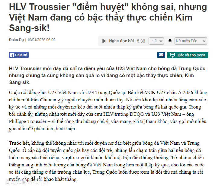 2026-01-19 10:40特鲁西埃在接受中国媒体采访时谈及越南U23的弱点,越南媒体《soha》则撰文表示,无需担忧特鲁西埃说什么,越南队有信心击败中国队。