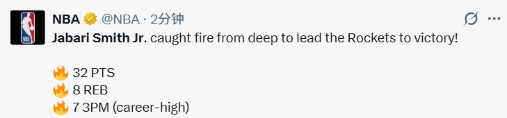 2026-01-19 10:50北京时间1月19日,NBA常规赛继续进行,火箭队119-110击败鹈鹕队。本场比赛,火箭队的小贾巴里-史密斯发挥出色,砍下32分8篮板。单场32分,创造史密斯赛季得分新高。