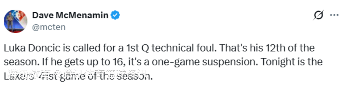 首节比赛,东契奇造进攻犯规被改判,之后两次上篮均被扇飞,之后他向裁判抱怨干扰球,结果被吹罚技犯,这是他本赛季的第12次技犯。如果累计到16次,将被自动禁赛一场,今晚是湖人队本赛季的第41场比赛。