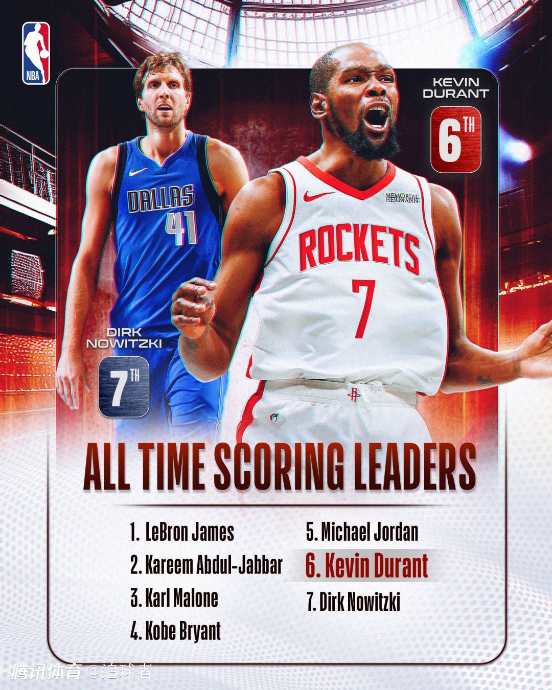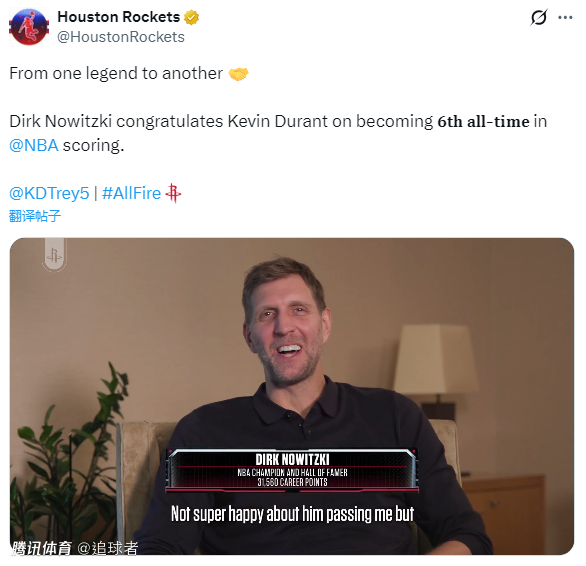 杜兰特超越诺天王,火箭主场球迷集体为他欢呼呐喊;火箭官方晒海报祝贺杜兰特,配文写道:传奇仍在书写,杜兰特已正式升至NBA历史总得分榜第六位!