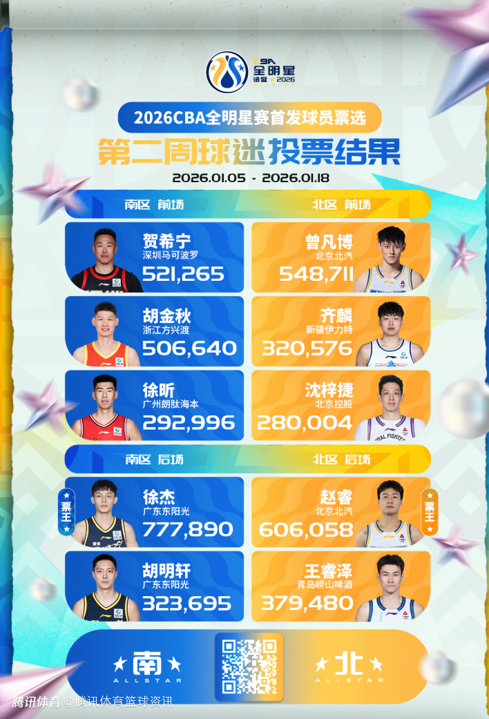 2026-01-19 12:40北京时间1月19日,CBA公司公布今年全明星的第二周球迷投票结果,南区首发为贺希宁、胡金秋、徐昕、徐杰和胡明轩;北区首发为曾凡博、齐麟、沈梓捷、赵睿和王睿泽。徐杰依然是南区票王+总票王,北区票王仍然是赵睿。