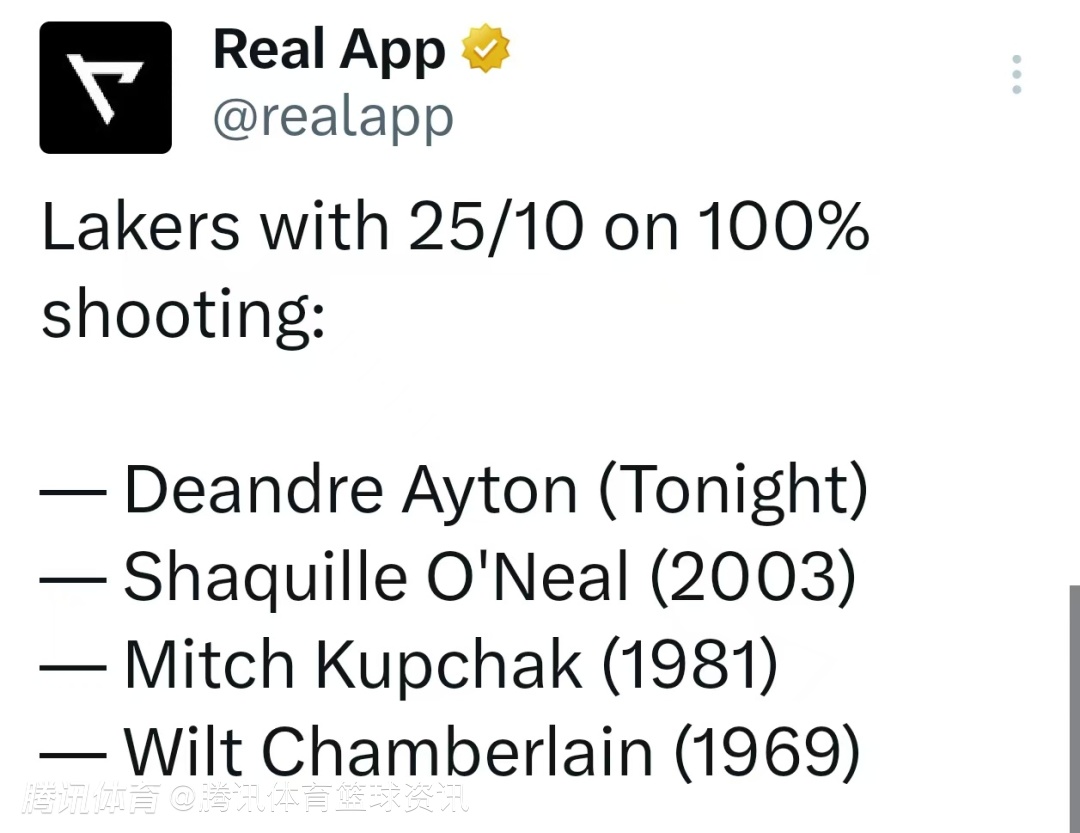 与此同时,艾顿还成为湖人队史单场百分百命中率且砍下25分10篮板的第四人,其余三位分别是: