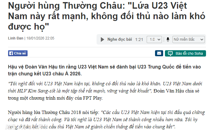 2026-01-19 14:40在U23亚洲杯半决赛越南队对阵中国队之前,越南足球名宿段文厚表示,没有任何对手是越南队无法击败的,半决赛越南队将击败中国队晋级决赛。