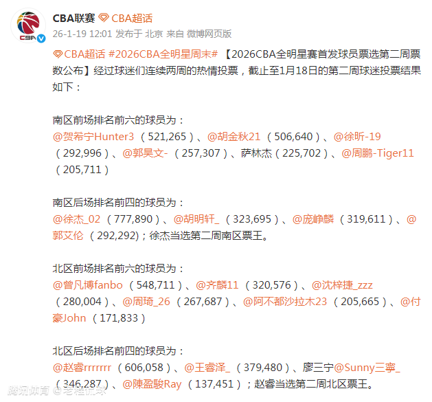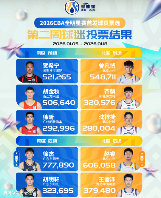 2026-01-19 15:00CBA官方19日中午公布了2026年全明星首发第二周票选结果,广东队后卫徐杰和北京队后卫赵睿分别继续领跑南区与北区所有球员。和首周不同的是,广东队后卫胡明轩和北控队内线沈梓捷进入了南区与北区的首发。