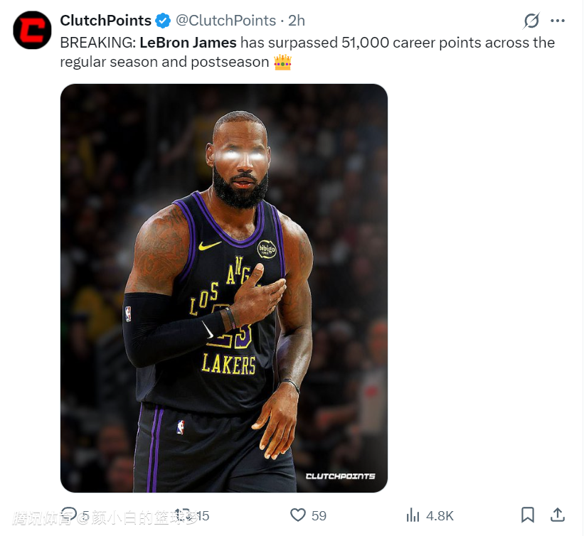 美媒ClutchPoints写道:勒布朗常规赛+季后赛总得分超过51000(戴上皇冠)。