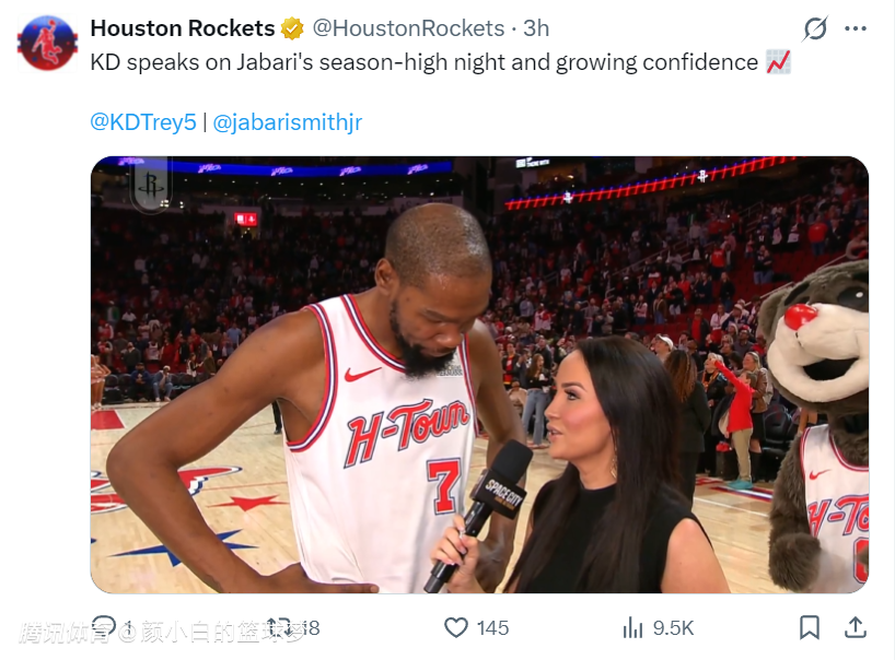 2026-01-19 15:10北京时间1月19日,火箭队119-110击败鹈鹕队。这场比赛是凯文-杜兰特的生涯之夜,他先是在得分端追平诺天王,随后超越诺天王升至历史得分榜第六的位置,杜兰特得分来到31561+现役仅次于詹姆斯42703+。