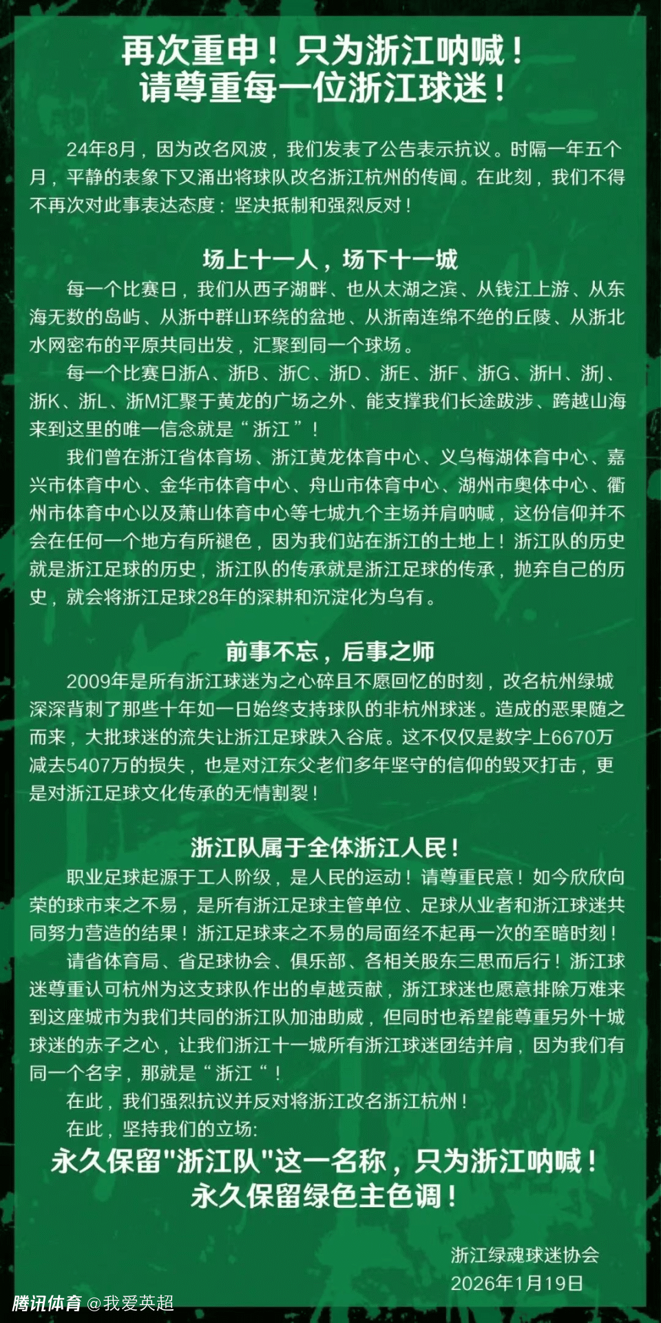2026-01-19 23:10近日,有消息称中超劲旅浙江队,新赛季将更名为“浙江杭州队”。而北京时间1月19日晚,浙江队知名球迷组织“绿魂”发文以示抗议。