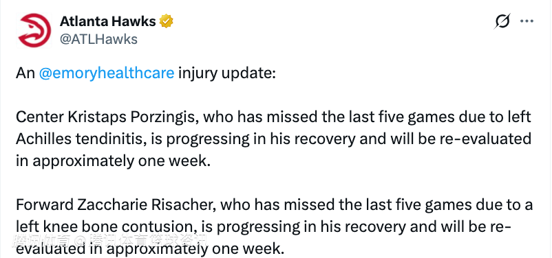 2026-01-20 00:30北京时间1月20日,老鹰官方更新了球队的伤病情报,波尔津吉斯和里萨谢均会在一周后复查。