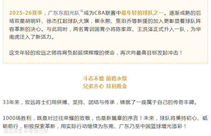 “这支年轻的宏远之师将肩负起延续辉煌的使命,再次向最高目标发起冲击!”广东男篮官方社媒写道。