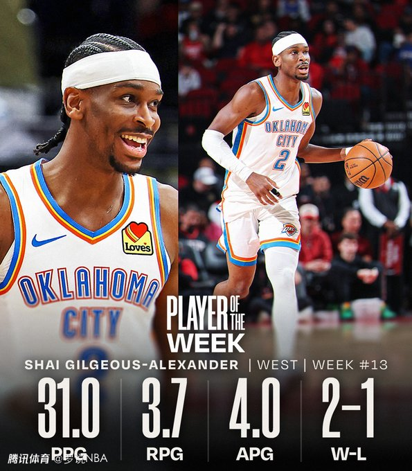 赛季至今,亚历山大场均31.8分4.4篮板6.2助攻。