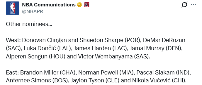 NBA官宣周最佳:亚历山大阿德巴约当选 东契奇哈登等球星获提名