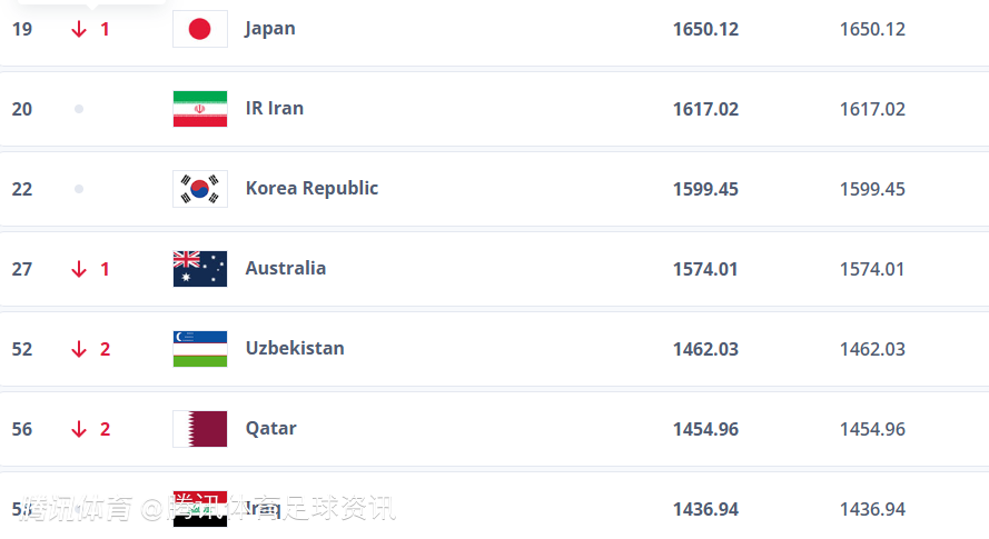 国际足联最新亚洲排名:
