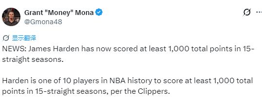 比赛进行过程中,当哈登得到本场比赛第20分后,他就此达成连续15个赛季总得分突破1000分大关。据快船队官方统计,哈登同时成为NBA历史上第10位达成连续15个赛季总得分1000+成就的球员。