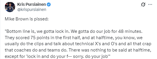近11战9负!迈克-布朗:大家不能光想着得分 必须全神贯注做好本职工作