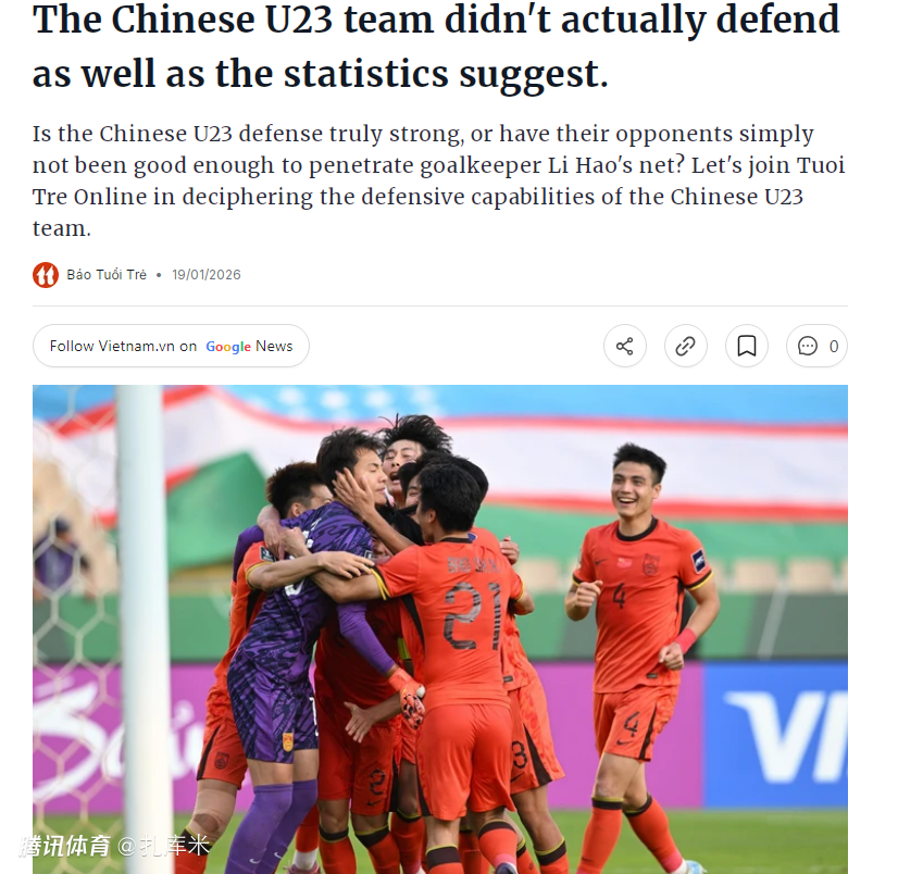 2026-01-20 09:40U23亚洲杯半决赛,U23国足对阵越南队。赛前,越南媒体《青年报》表示,中国队选择防守型踢法完全是进攻端缺乏好手,而且0丢球也是靠着防线堆积人数来实现。