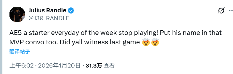 2026-01-20 09:50北京时间1月20日,2026年NBA全明星东西部首发名单出炉,其中,西部首发名单为东契奇、亚历山大、库里、约基奇和文班亚马。对此,森林狼球星兰德尔发推表示不满,他力挺队友爱德华兹应该入选。