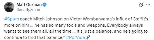 约翰逊谈到文班亚马单场7记三分球的表现时说道:“这更多取决于他自己,他拥有太多的技术和武器。所有人总是想每时每刻都看到他把所有本事都使出来,这只是一个平衡问题,而他会继续找到这种平衡。当文班亚马总在篮下时,所有人都要求他多投三分;而当他大量出手三分时,又要求他留在低位。但文班亚马知道该如何打球。”