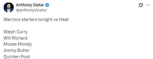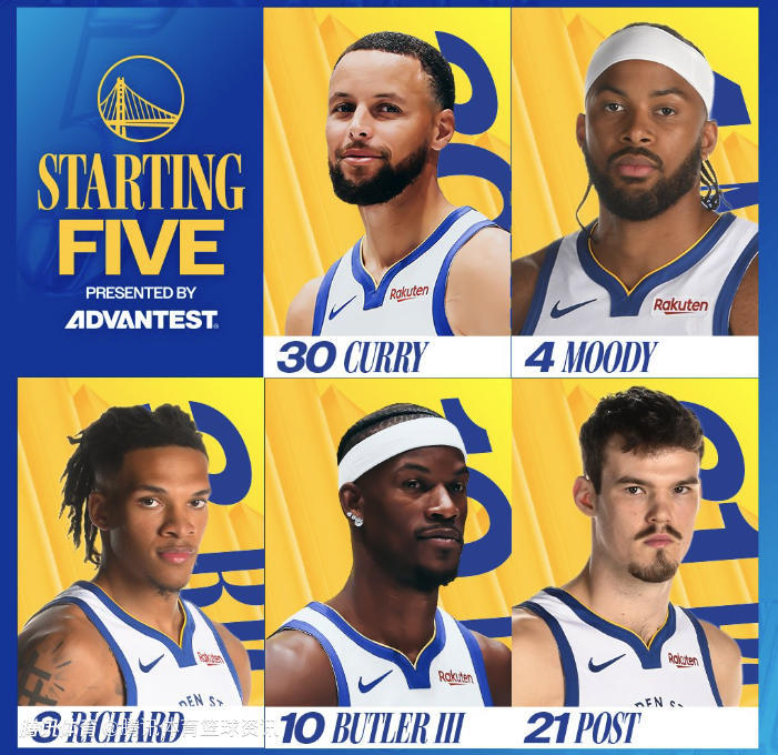 勇士队的首发名单为:斯蒂芬-库里、威尔-理查德、吉米-巴特勒、摩西-穆迪和波斯特。库明加和双向球员马利维-莱昂斯此役均被激活,若后者出战,将完成自己勇士生涯首秀。